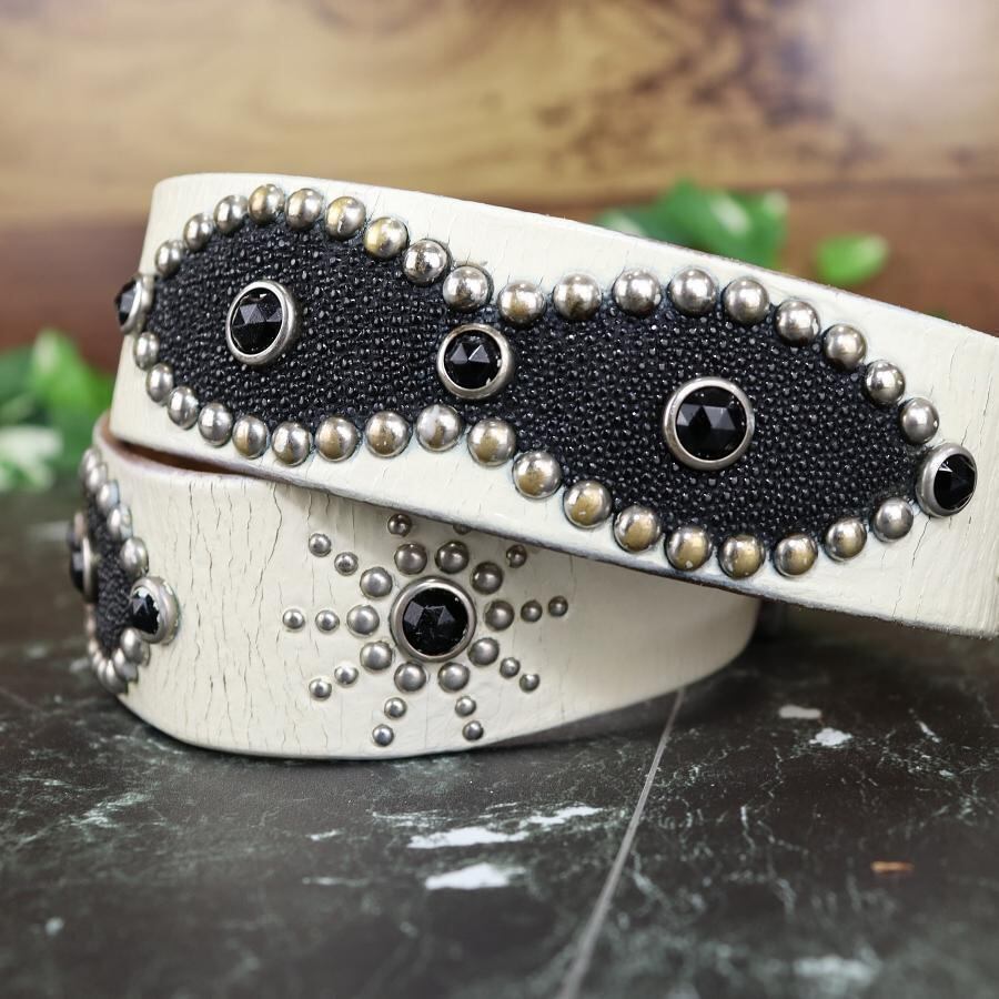 HTC ピーナッツスタッズベルト ホワイト×ブラック 34インチ 本革×エイ革