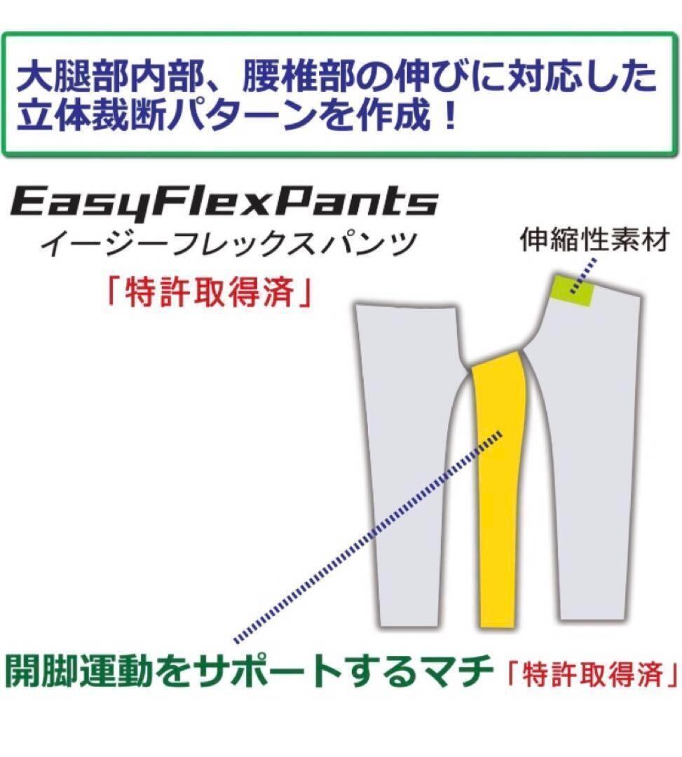 「服装解剖学」理論を導入して完成させた、革新的なワーキングウェア。すべては「動きやすさ」の為に。すべてはワーカーの「安全」の為に。 【姿勢の変化による運動量を、解剖学的に検証して生まれたワークパンツ】大腿部内部、腰椎部の伸びに対応した立体裁断パターンを作成。従来は開脚作業時に内股ぐりがつっぱり、動きが制約されていましたが、カッティングと伸縮素材を使用することで作業効率を大きく改善しました。 《腰部イージーフレックス仕様》後腰部に伸縮メッシュを施すことで、前後斜めの屈伸の動きをスムーズにします。●イージーフレックス:特許取得済 《股部 新立体裁断構造(フル開脚仕様)》開脚運動をサポートするマチを股下部分に入れることにより、開脚姿勢をとった際の引きつれを防止し、快適に作業を行うことができます。 《パンツ脇エアレーション機能》パンツ内にこもった蒸気を、足の動きとともに膝の外側から排出させるスリットを設けています。 《カラビナループ》カラビナやキーリングを通せるよう、右第2ベルトループのみ長くなっています。