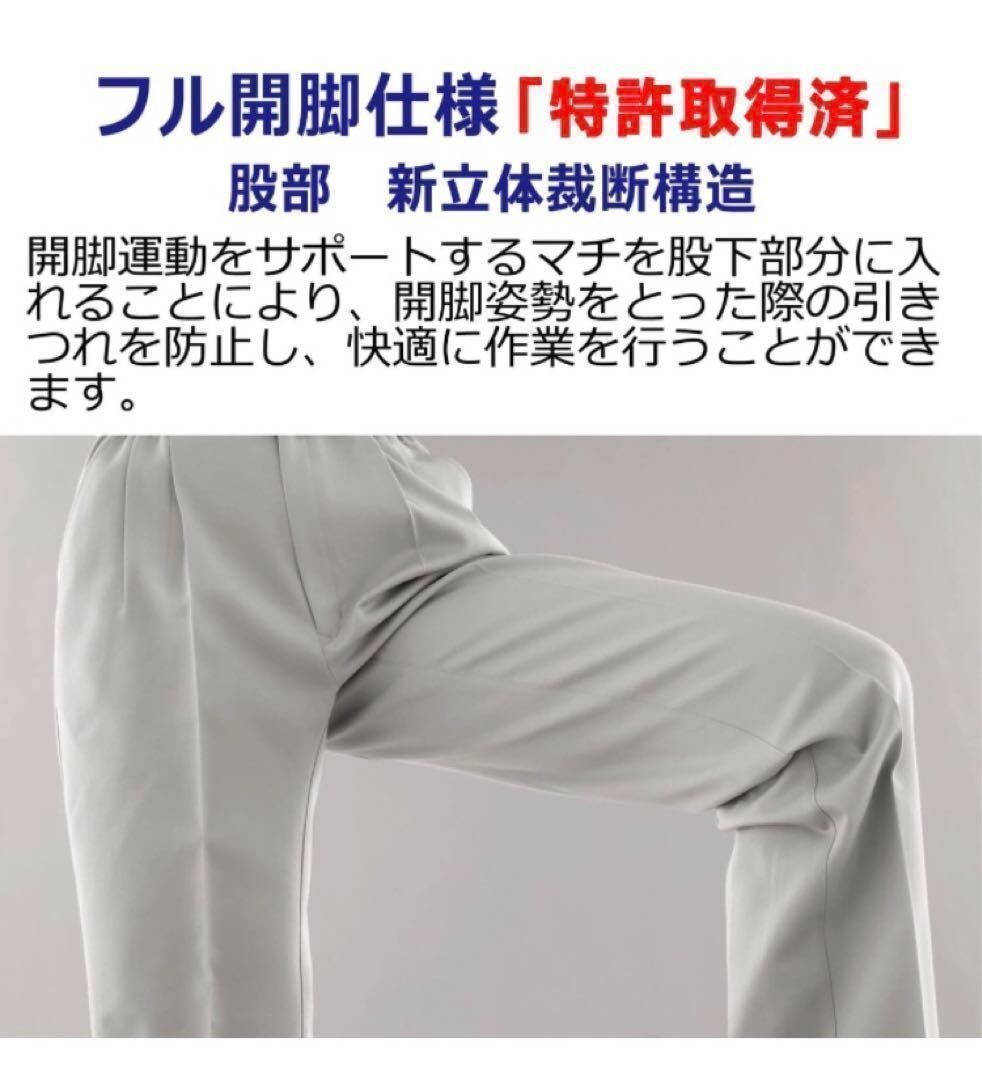 「服装解剖学」理論を導入して完成させた、革新的なワーキングウェア。すべては「動きやすさ」の為に。すべてはワーカーの「安全」の為に。 【姿勢の変化による運動量を、解剖学的に検証して生まれたワークパンツ】大腿部内部、腰椎部の伸びに対応した立体裁断パターンを作成。従来は開脚作業時に内股ぐりがつっぱり、動きが制約されていましたが、カッティングと伸縮素材を使用することで作業効率を大きく改善しました。 《腰部イージーフレックス仕様》後腰部に伸縮メッシュを施すことで、前後斜めの屈伸の動きをスムーズにします。●イージーフレックス:特許取得済 《股部 新立体裁断構造(フル開脚仕様)》開脚運動をサポートするマチを股下部分に入れることにより、開脚姿勢をとった際の引きつれを防止し、快適に作業を行うことができます。 《パンツ脇エアレーション機能》パンツ内にこもった蒸気を、足の動きとともに膝の外側から排出させるスリットを設けています。 《カラビナループ》カラビナやキーリングを通せるよう、右第2ベルトループのみ長くなっています。